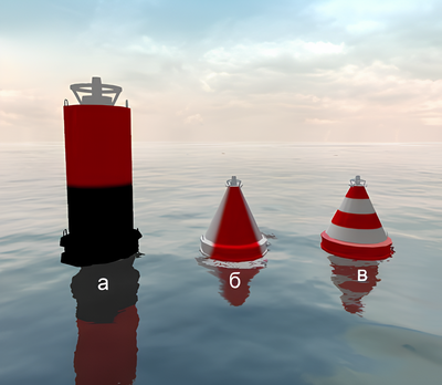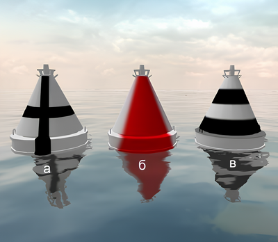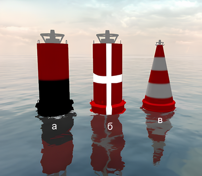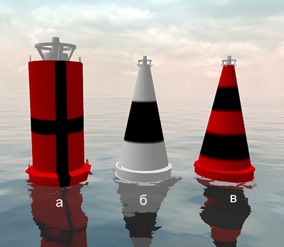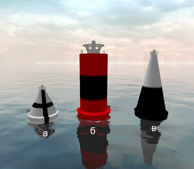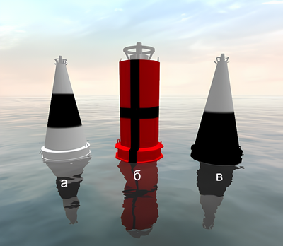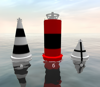 Какой из изображенных на иллюстрации плавучих навигационных знаков называется "Знак опасности"?