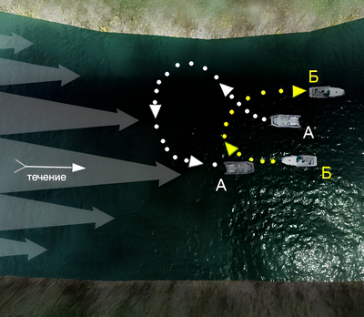 На каком из этих судов (А или Б) при движении по течению правильно производится поворот на обратный курс?