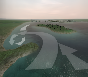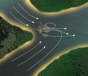 Как называется вращательное движение воды в реке, возникающее, как правило, за выступами берегов, мысами, выпуклыми берегами, мостовыми опорами, дамбами?