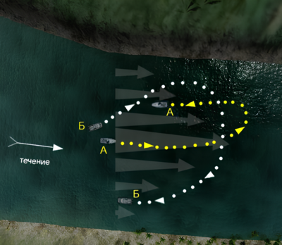 На каком из этих судов (А или Б) при движении против течения правильно производится поворот на обратный курс?