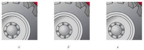 Отсутствие одной гайки крепления колеса и ступицы (а).