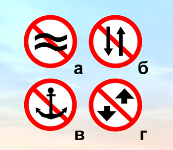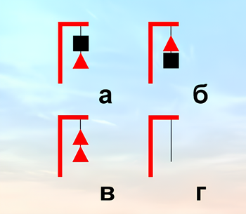 Какие из изображенных сочетаний сигнальных фигур на семафорной мачте запрещают судам, следующим по течению, проход на участке с односторонним движением?