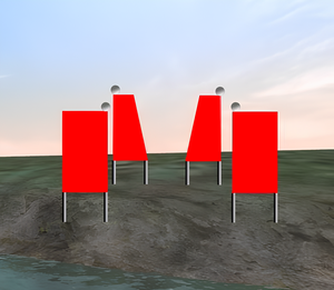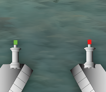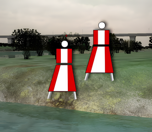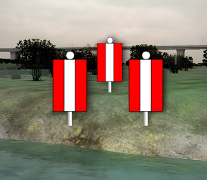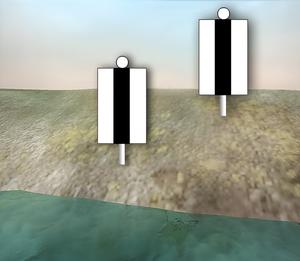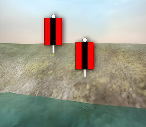 Как называются изображенные на иллюстрации береговые навигационные знаки, выставленные при входе в искусственное русло?