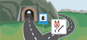 Указывает категорию автодорожного тоннеля, а также альтернативный маршрут движения для транспортных средств, которым запрещен проезд через тоннели категории D.